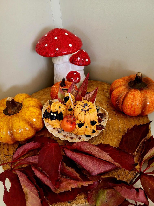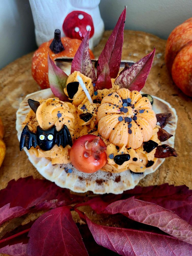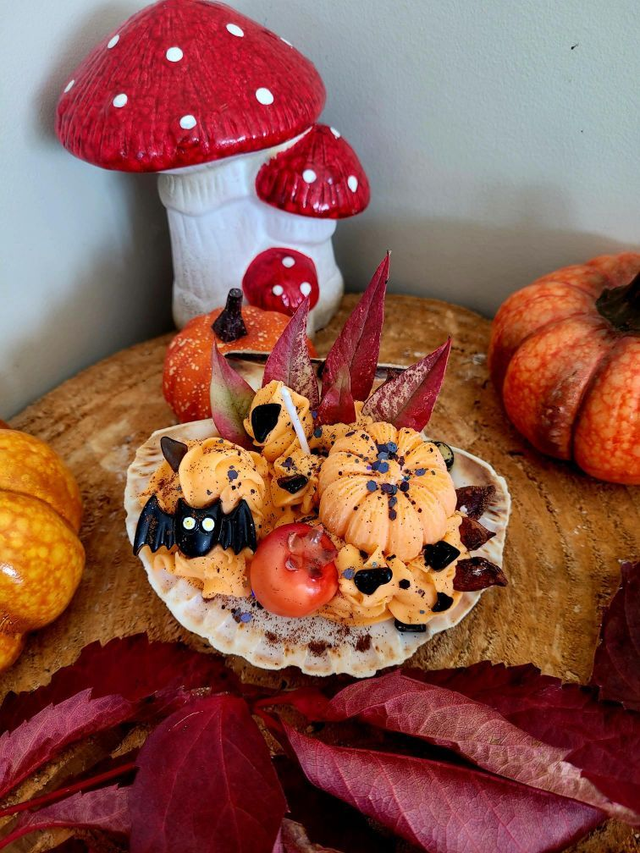 Sa chantilly, naturellement colorée en orange, s’orne d’une figurine chauve-souris, tandis que les trésors d’automne ramassés en forêt, feuilles séchées et cannelle créent une atmosphère chaleureuse et magique.