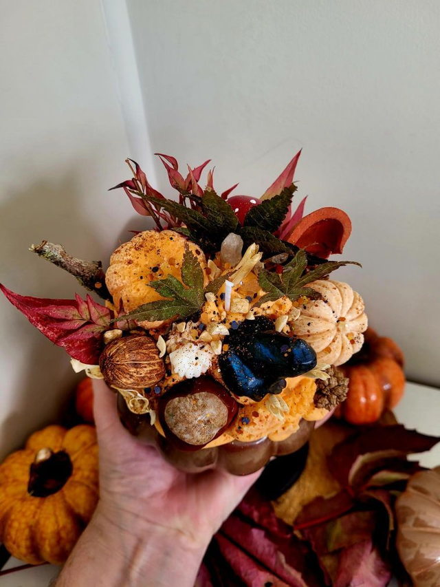 La Bougie XXL Citrouille et sa grenouille est une création automnale unique : fondant citrouille parfumé, ornée d’une grenouille en labradorite protectrice, feuilles d’érable et bois ramassé en forêt.