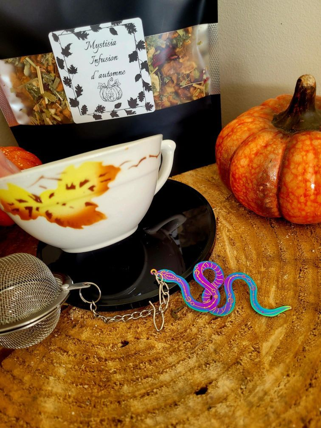 Accompagné de sa boule à thé ornée d’une breloque serpent et de sa tasse en porcelaine automnale, ce rituel gourmand invite à la détente et à la protection.