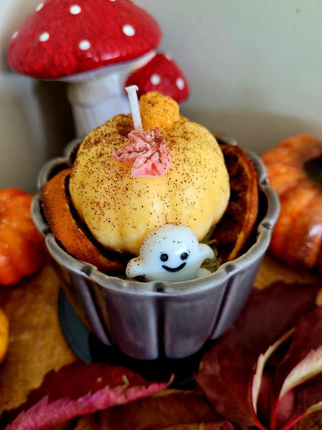 Une petite figurine de fantôme veille sur la flamme, invitant à éveiller vos énergies et à élever votre taux vibratoire.