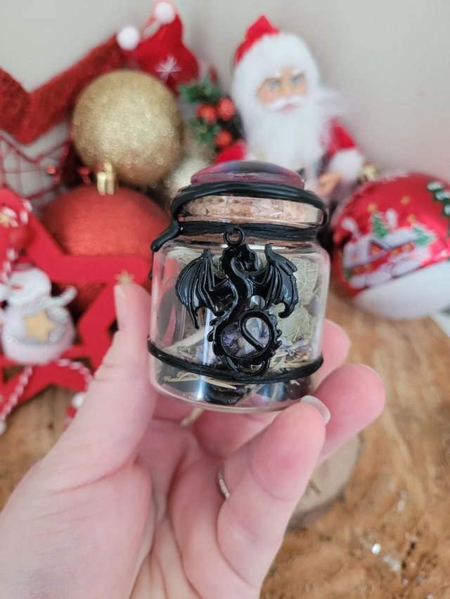 La Spell Jar Dragon s’inscrit dans un univers mystique où la symbolique du dragon se mêle aux vertus des plantes : courage, puissance intérieure et protection contre les influences négatives. Chaque élément est disposé avec attention pour créer un équilibre harmonieux et renforcer votre énergie au quotidien.