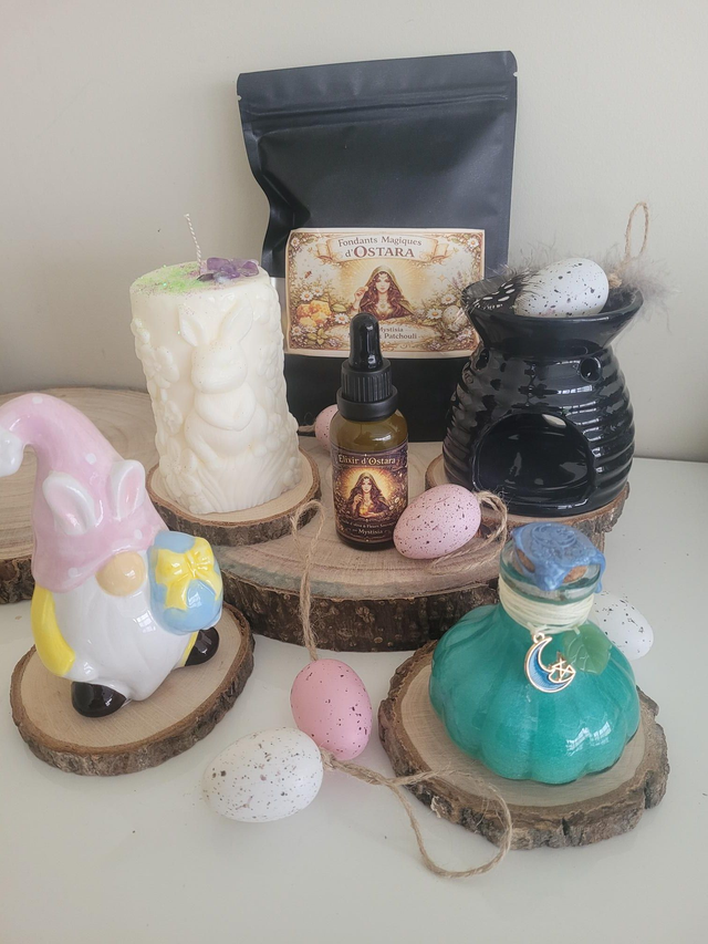 Le coffret Ostara réunit des créations artisanales dédiées à la renaissance : élixir aux fleurs sauvages pour soutenir l’énergie du renouveau, bougie rituelle ornée d’améthyste pour lumière et clarté, fondants patchouli & menthe pour ancrage et purification, brûleur noir de transformation, fiole d’eau de pluie bénie pour accompagner vos intentions, gnome gardien protecteur des cycles naturels, parchemin & rituel guidé pour célébrer le printemps.